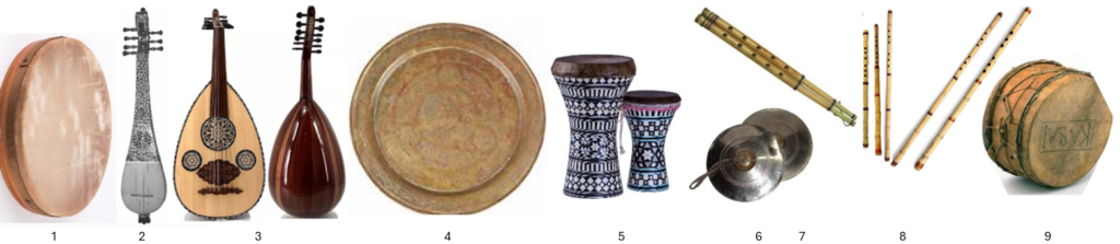 Comme Myriam et les femmes d’Israël qui célébrèrent la délivrance en musique, les Juifs du Yémen ont porté leurs chants et leurs instruments jusqu’aux rives de l’exil, témoignant que la marche vers la liberté s’accompagne toujours d’une mélodie. Leur tradition musicale, transmise de génération en génération, ne se limitait pas au tambourin [1] évoqué dans le Chant de Myriam : elle s’exprimait à travers un ensemble d’instruments emblématiques — qanbûs , ‘oûd [3], sahn nuḥās [4], darbouka [5], manqûsh / naqûsh [6], mijwiz [7], ney [8] et timbal / mirwās [9].